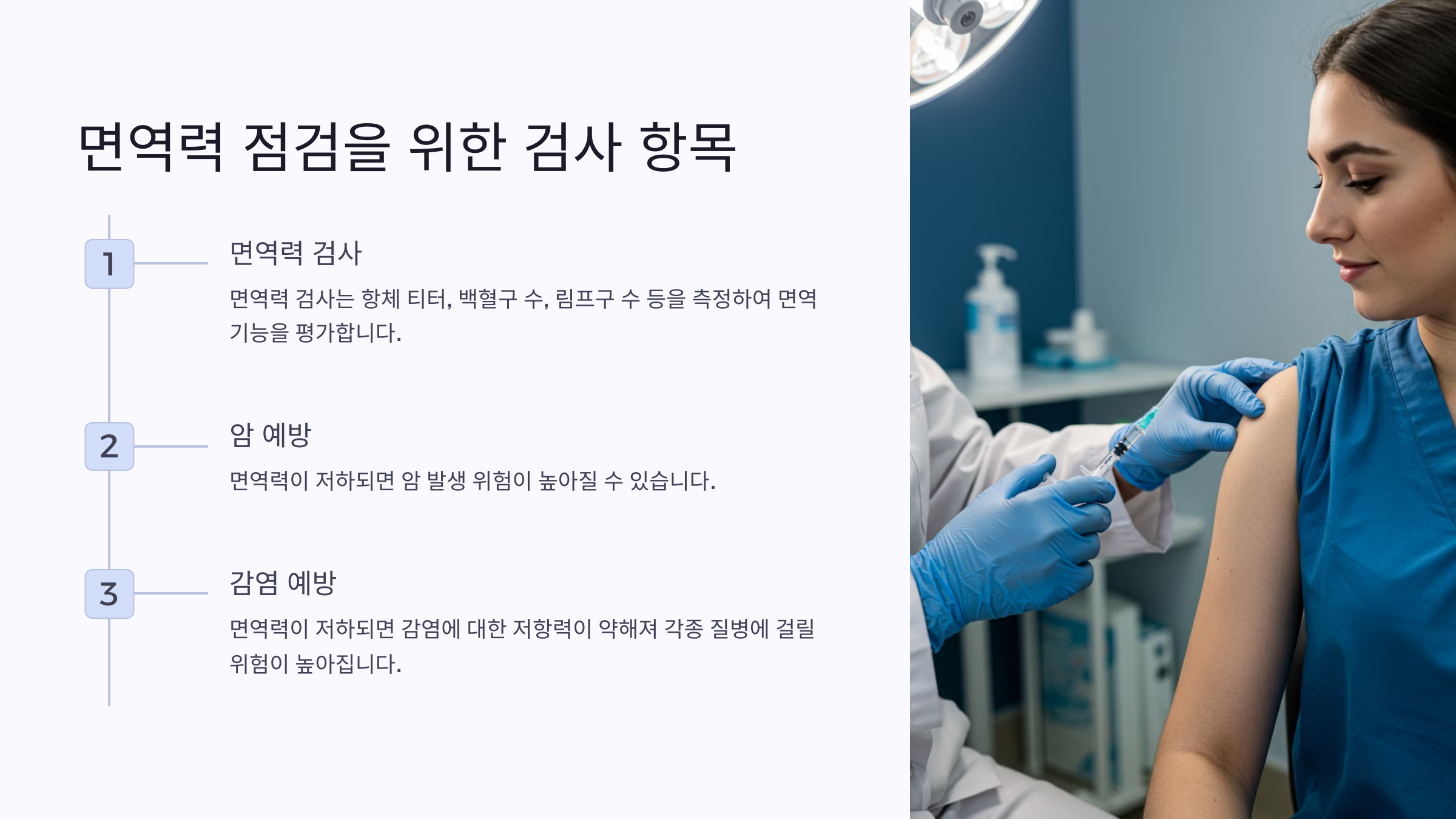 면역력은 우리 몸을 바이러스와 세균으로부터 보호하는 방패 같은 역할을 해요. 하지만 스트레스, 영양 불균형, 수면 부족 등의 요인으로 면역력이 약해지면 각종 감염 질환에 쉽게 노출될 수 있어요. 2025년 건강검진에서는 면역력 저하를 조기에 발견할 수 있도록 다양한 검사 항목이 추가되었어요.